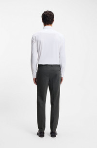 SIZE AND FIT The model wears a size 32R and is 6'1" tall with a, 37" chest, 29" waist and 35" hips. DETAILS Update your business-travel capsule with the wrinkle resistance and flexible stretch of these washable BOSS Menswear trousers. Cut to a defined fit. Slim fit Button and zip closure Elastic Waistband Pockets bottom front: Side slash pockets Pockets bottom back: Jetted pockets Partially lined P-Genius-JCWWGPK261F - 50553572 QUALITY & CARE INSTRUCTIONS Material: 45% Polyamid, 33% Polyester, 15% Viscose, 7% Elastane Do Not Bleach Do Not Dry Clean Do Not Tumble Dry Do Not Iron mild professional wet clean Cold, gentle machine wash; reduced spin speed.