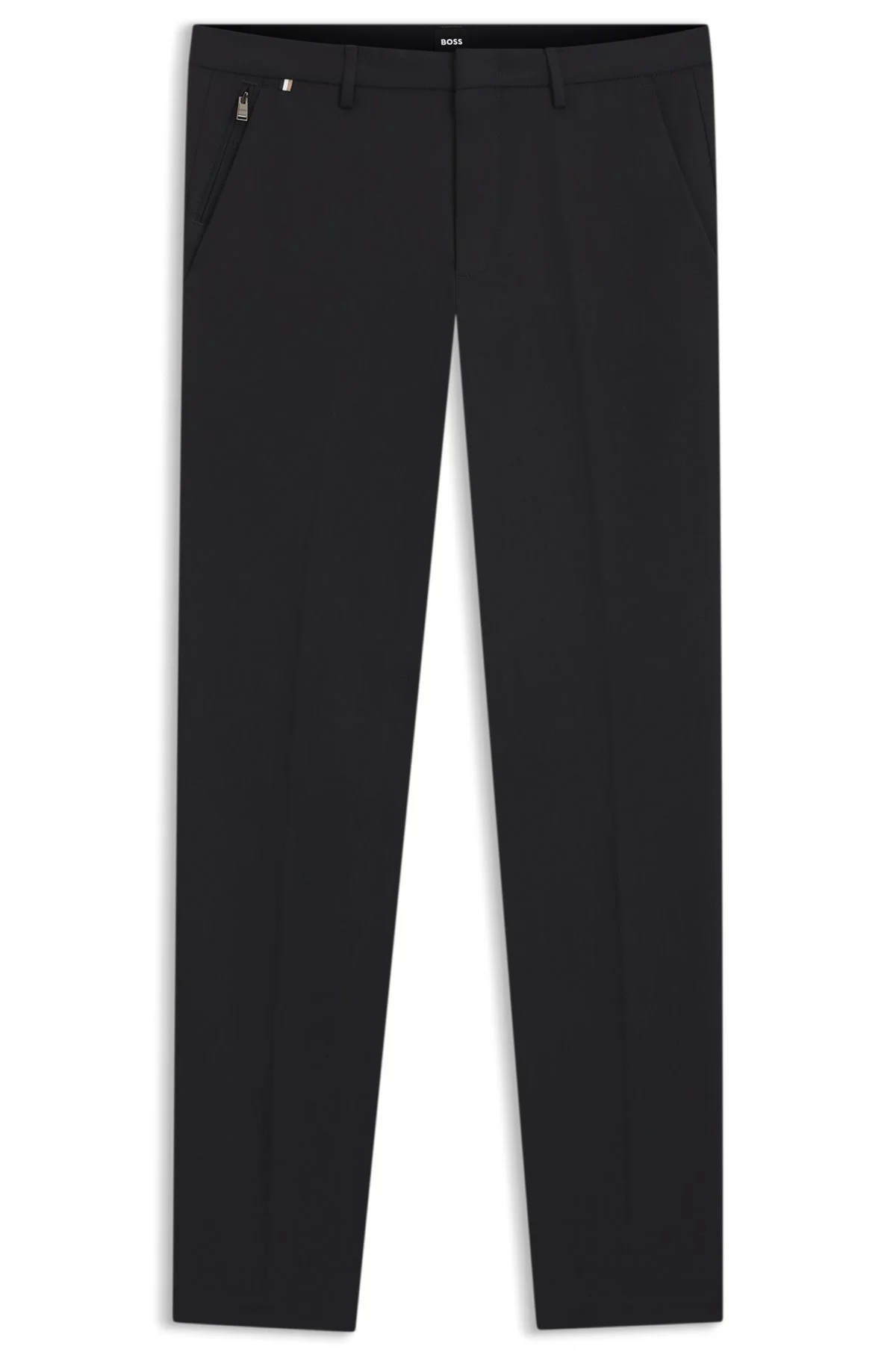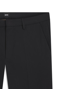 SIZE AND FIT The model wears a size 32R and is 6'2" tall with a, 37" chest, 30" waist and 37" hips. DETAILS Kaito1_T - 50487754 Easy-wear trousers by BOSS Menswear. Crafted in a stretch blend for comfort, this regular-rise pair is cut to a defined fit. Slim fit Regular rise Hook and zip closure Counter button Pockets bottom front: Side zip pocket Pockets bottom back: Jetted pockets QUALITY & CARE INSTRUCTIONS Iron Low Heat Quality: 57% Cotton, 35% Polyamide, 8% Elastane, pocketing: 65% Polyester, 35% Cotton Machine Wash Cold Gentle Reduced Dry Clean Do Not Bleach Do Not Tumble Dry