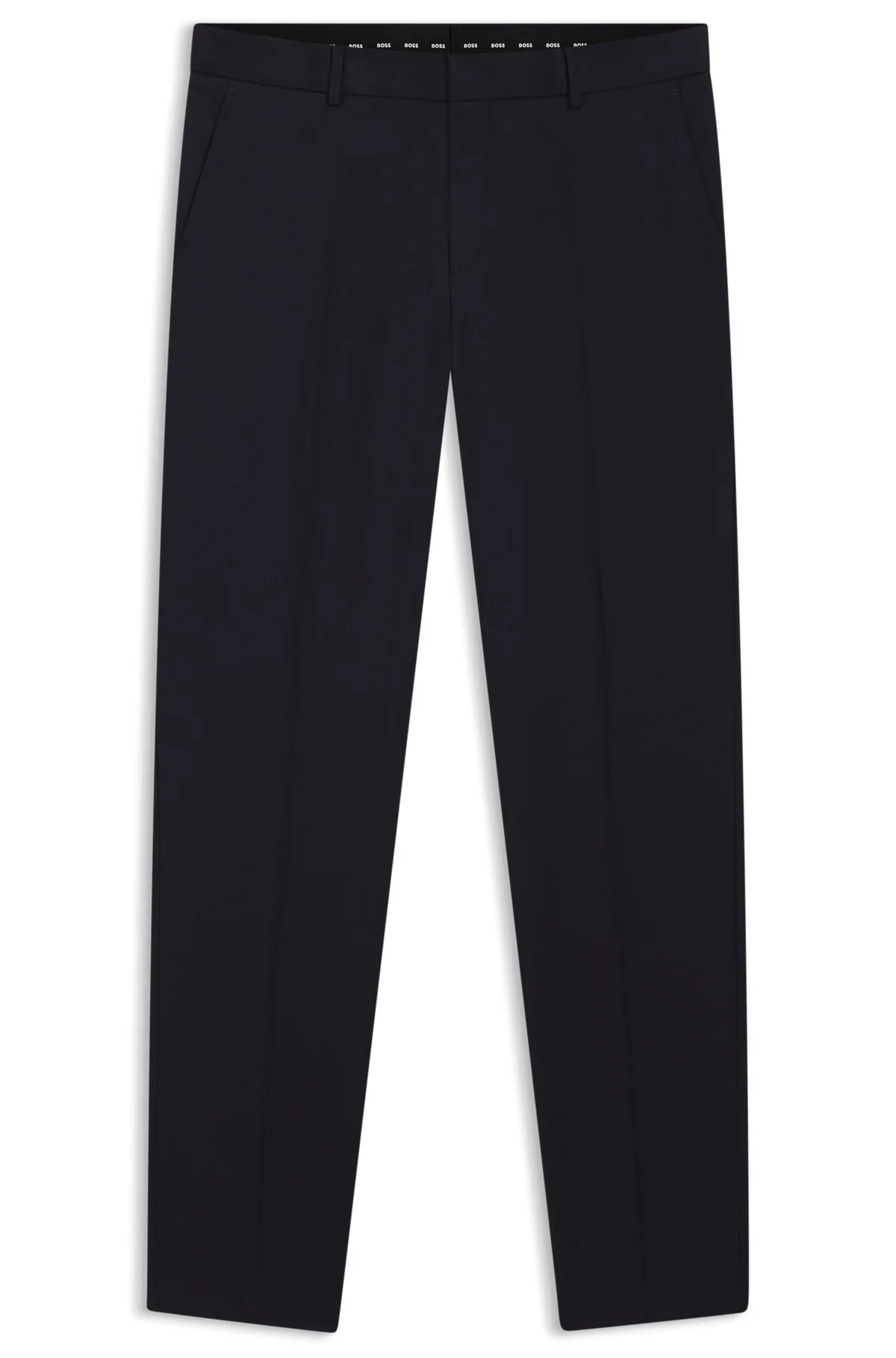 SIZE AND FIT The model wears a size 32R and is 6'2" tall with a, 35" chest, 30" waist and 36" hips. DETAILS H-Genius-B1 - 50469174 Cut a precise figure in these formal BOSS Menswear trousers. Crafted in finest wool with a serge weave and natural stretch for comfort. Slim fit. Slim fit Hook and zip closure Crease Pockets bottom front: French pocket Pockets bottom back: Jetted pockets QUALITY & CARE INSTRUCTIONS Reduced Dry Clean Do Not Bleach Do Not Tumble Dry Iron Medium Heat Do Not Wash Quality: 100% Virgin wool, pocketing: 65% Polyester, 35% Cotton, knee lining: 100% Viscose