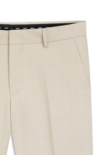 SIZE AND FIT The model wears a size 32R and is 6'1" tall with a, 34" chest, 30" waist and 36" hips. DETAILS Cut a precise figure in these formal BOSS Menswear trousers. Crafted in finest wool with a serge weave and natural stretch for comfort. Slim fit Slim fit Hook and zip closure Straight leg Crease Pockets bottom front: French pocket Pockets bottom back: Jetted pockets Partially lined H-Genius-B1 - 50469174 QUALITY & CARE INSTRUCTIONS Reduced Dry Clean Do Not Bleach Do Not Tumble Dry Iron Medium Heat Material: 100% Virgin wool, pocketing: 65% Polyester, 35% Cotton, knee lining: 100% Viscose Do Not Wash