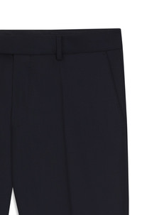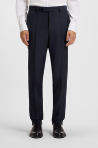 SIZE AND FIT The model wears a size 32R and is 6'2" tall with a, 36" chest, 31" waist and 35" hips. DETAILS L-Glover-241-LC - 50509898 Refined slim-fit trousers by BOSS Menswear. This pair is crafted in fabric blended with stretch for comfort in movement. Slim fit QUALITY & CARE INSTRUCTIONS Do Not Wash Quality: 98% Virgin wool, 2% Elastane, pocketing: 100% Cotton, knee lining: 100% Viscose Reduced Dry Clean Iron Medium Heat Do Not Bleach Do Not Tumble Dry
