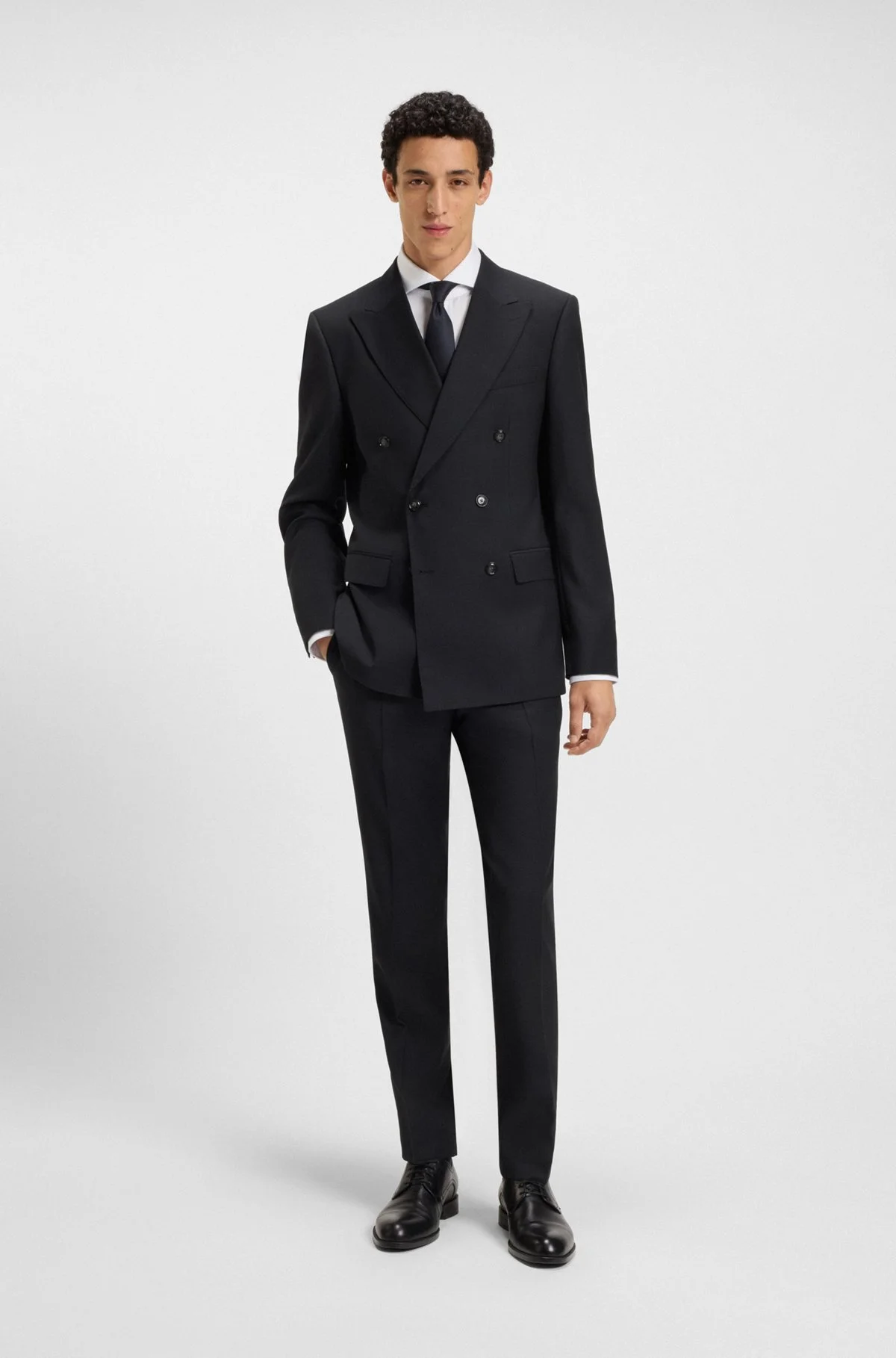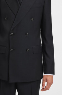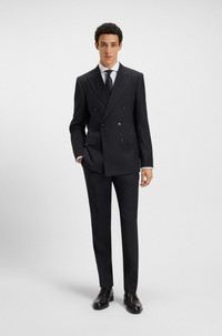SIZE AND FIT The model wears a size 38R and is 6'1" tall with a, 32" chest, 28" waist and 34" hips. DETAILS Detailed with a pinstripe pattern for classic character, this BOSS Menswear suit will tune up your workwear and formal options. Crafted in virgin wool with natural stretch, this two-piece suit is tailored to a streamlined fit for a contemporary profile. The jacket features a modern double-breasted closure and constructed shoulders. Slim fit Peaked lapels Number of buttons: Double-breasted Jetted chest pockets Pockets top: Flap pockets Fully lined Packaging: Dust bag H-Huge-2pcs-DB-254 - 50551767 QUALITY & CARE INSTRUCTIONS Quality: 100% Virgin wool, Lining: 95% Polyester, 5% Elastane, Sleeve lining: 100% Viscose, knee lining: 100% Viscose Do Not Bleach Do Not Wash Reduced Dry Clean Iron Low Heat Do Not Tumble Dry