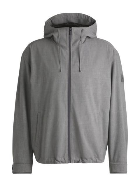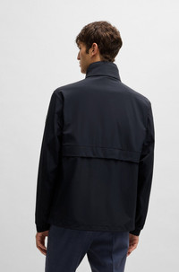 SIZE AND FIT The model wears a size 38R and is 6'2" tall with a, 37" chest, 30" waist and 37" hips. DETAILS P-Caldar - 50528439 Topped with a packable hood for optional cover, this washable BOSS Menswear jacket is crafted in super-stretch softshell fabric for flexible comfort. Regular fit. Regular fit Hooded collar Fastening top: Zip closure Pockets top: Welt pockets Elasticized cuffs Partially lined Standard length Fit back length: 72 cm (28 inches) QUALITY & CARE INSTRUCTIONS Do Not Tumble Dry Quality: 88% Polyamide, 12% Elastane, Lining: 100% Polyamid, Knitwear: 98% Polyester, 2% Elastane Machine Wash Cold Do Not Bleach Iron Low Heat Do Not Dry Clean