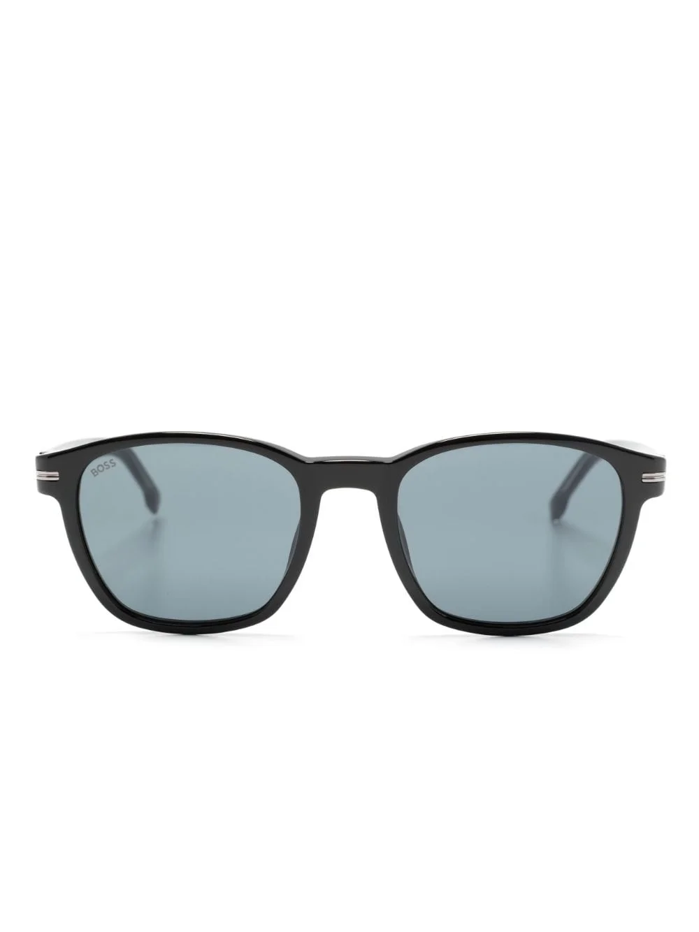 square-frame sunglasses black grey tinted lenses logo print to the front square frame curved tips These glasses come with a protective case. Imported Composition Plastic 100% SIZE & FIT Measurement Arm Length 5.7 in(14.5 cm) Bridge Width 0.78 in(2 cm) Lens Diameter 2.04 in(5.2 cm) Total Width 5.51 in(14 cm)