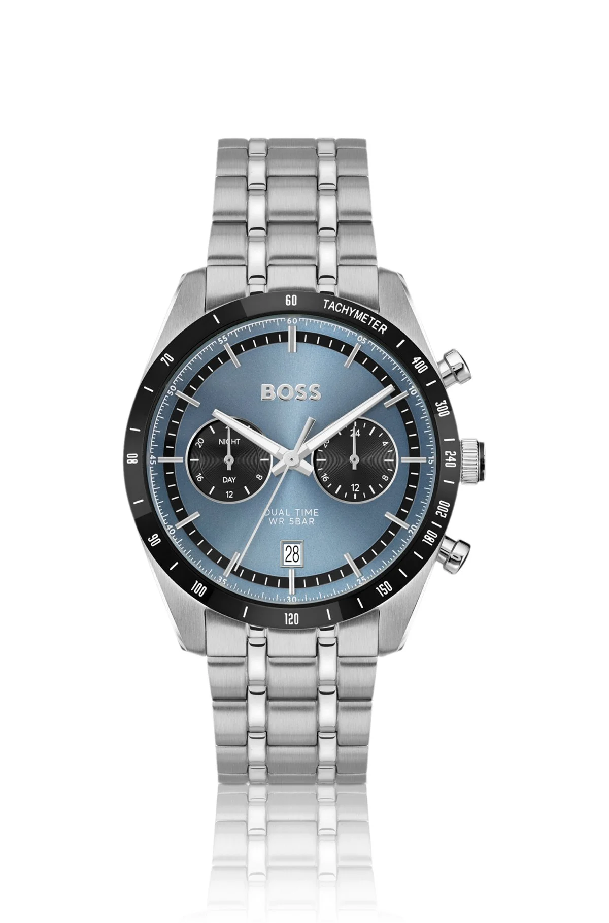 DETAILS Combining a sporty tachymeter with elegant, racing-inspired design details, this BOSS Menswear watch is an instant classic. Blue, multi-level dial inside domed glass. Dial color: Blue Strap material: Stainless steel Closure: Push-button deployment Case size: 1.61 in (41 mm) (0 inches) Water Resistance (in ATM): 5 ATM TOURMASTER - 58564962 QUALITY & CARE INSTRUCTIONS Material: 100% Stainless steel