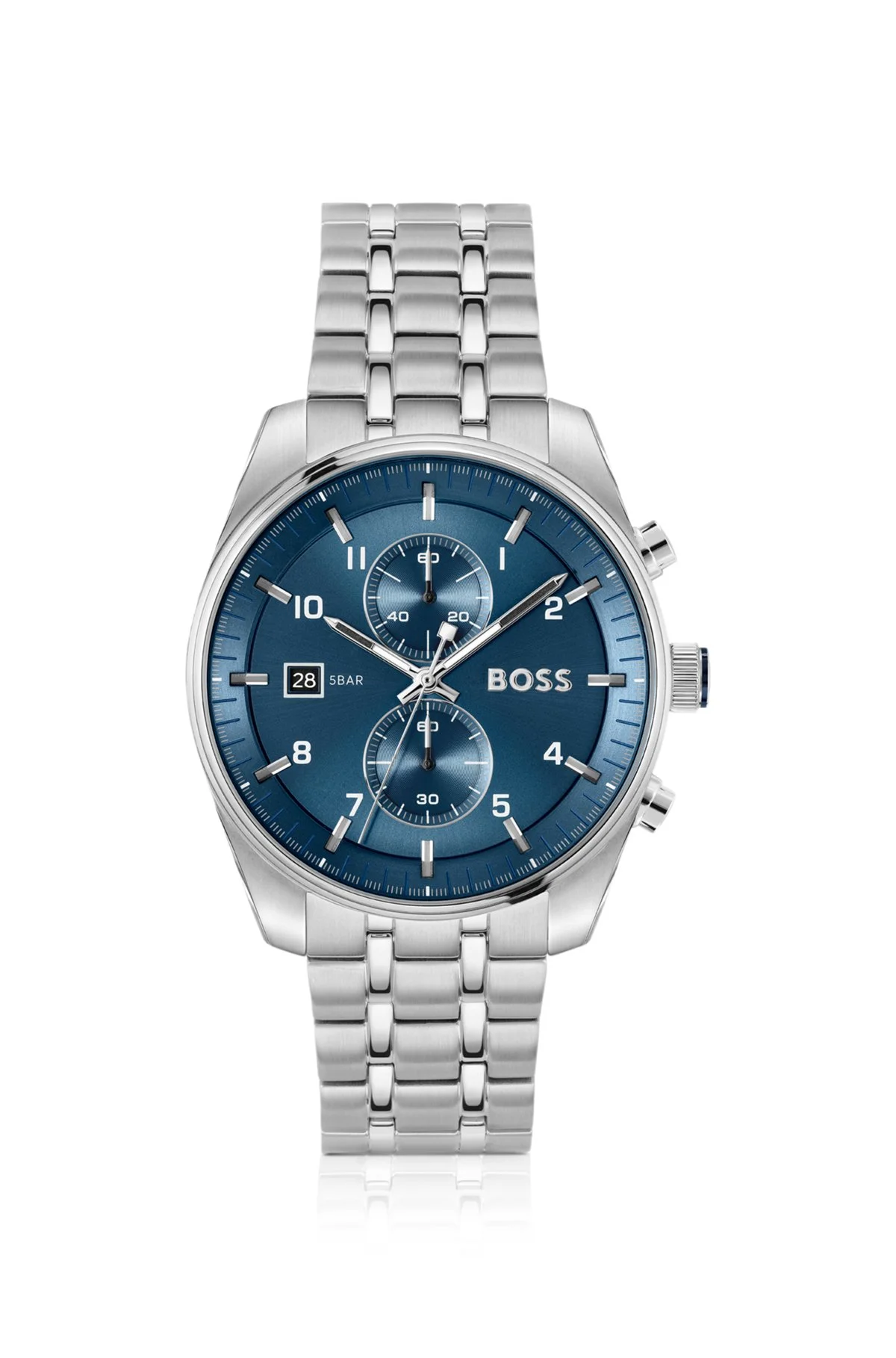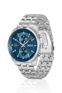 DETAILS Combining cool silver and blue tones, this BOSS Menswear watch delivers a modern pilot-inspired look. Sunray-brushed dial with shaped indexes and two subeyes. Watch mechanism: Chronograph Dial color: Blue Strap material: Stainless steel Closure: Push-button deployment Case size: 1.73 in (44 mm) (0 inches) Water Resistance (in ATM): 5 ATM SKYTRAVELLER - 58564955 QUALITY & CARE INSTRUCTIONS Material: 100% Stainless steel