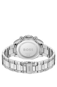 DETAILS This BOSS Menswear chronograph watch offers a modern, racing-inspired look with its tachymeter bezel and layered dial. Cool steel with green sunray-brushed dial. Watch mechanism: Chronograph Dial color: green Strap material: Stainless steel Closure: Push-button deployment Case size: 1.69 in (43 mm) (0 inches) Water Resistance (in ATM): 5 ATM HERO 2.0 - 58564951 QUALITY & CARE INSTRUCTIONS Material: 100% Stainless steel