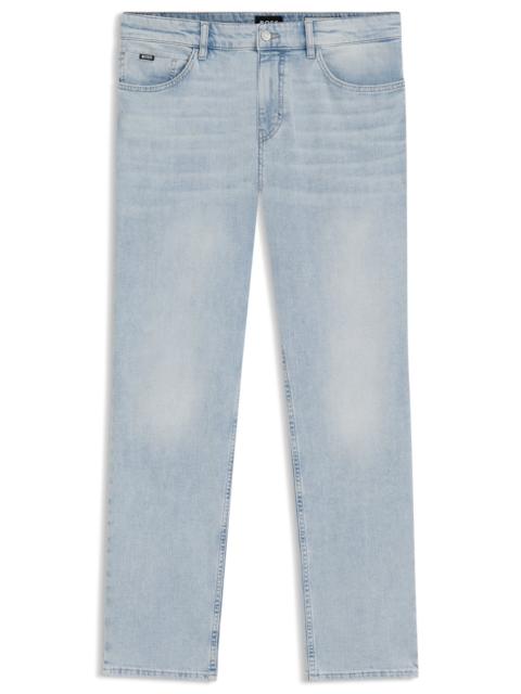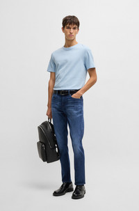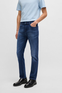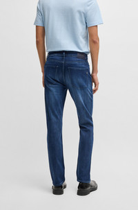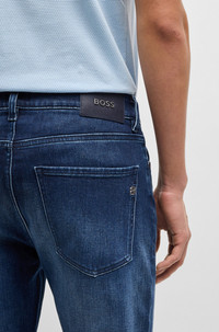 SIZE AND FIT The model wears a size 32/32 and is 6'2" tall with a, 37" chest, 30" waist and 37" hips. DETAILS H-Delaware - 50538548 With authentic treatments adding modern character, these BOSS Menswear jeans are a valuable casual option. Cut to a defined fit in dark-blue stretch denim. Slim fit Regular rise Button and zip closure Pockets bottom front: Side pockets Slim leg Pockets bottom back: Patch pocket Standard length Fit foot width: 35,4 cm (13.9 inches) QUALITY & CARE INSTRUCTIONS Machine Wash Cold Gentle Do Not Dry Clean Quality: 94% Cotton, 5% Elastomultiester, 1% Elastane Iron Medium Heat Do Not Bleach Do Not Tumble Dry