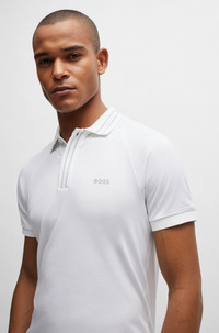 SIZE AND FIT The model wears a size M and is 6'2" tall with a, 38" chest, 29" waist and 36" hips. DETAILS Paule 2_NCSA - 50514854 A logo-detail polo shirt with contrast stripes by BOSS Menswear, cut to a slim fit in stretch cotton with pointelle sleeves. Slim fit Neckline: Flat-knit collar Number of buttons: 3 Short sleeves Flat-knit cuffs Standard length QUALITY & CARE INSTRUCTIONS Iron Low Heat Quality: 95% Cotton, 5% Elastane, Sleeve: 75% Cotton, 25% Polyester Machine Wash Cold Gentle Do Not Bleach Do Not Tumble Dry Do Not Dry Clean
