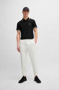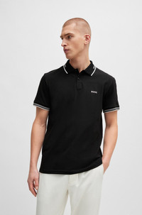 SIZE AND FIT The model wears a size L and is 6'2" tall with a, 38" chest, 31" waist and 37" hips. DETAILS Paul - 50506193 A contemporary polo shirt cut to a defined fit by BOSS Menswear, created in stretch cotton with contrast stripes and branding. Slim fit Neckline: Flat-knit collar Number of buttons: 2 Short sleeves Flat-knit cuffs Standard length QUALITY & CARE INSTRUCTIONS Do Not Tumble Dry Quality: 92% Cotton, 8% Elastane Do Not Bleach Machine Wash Cold Gentle Iron Low Heat Do Not Dry Clean