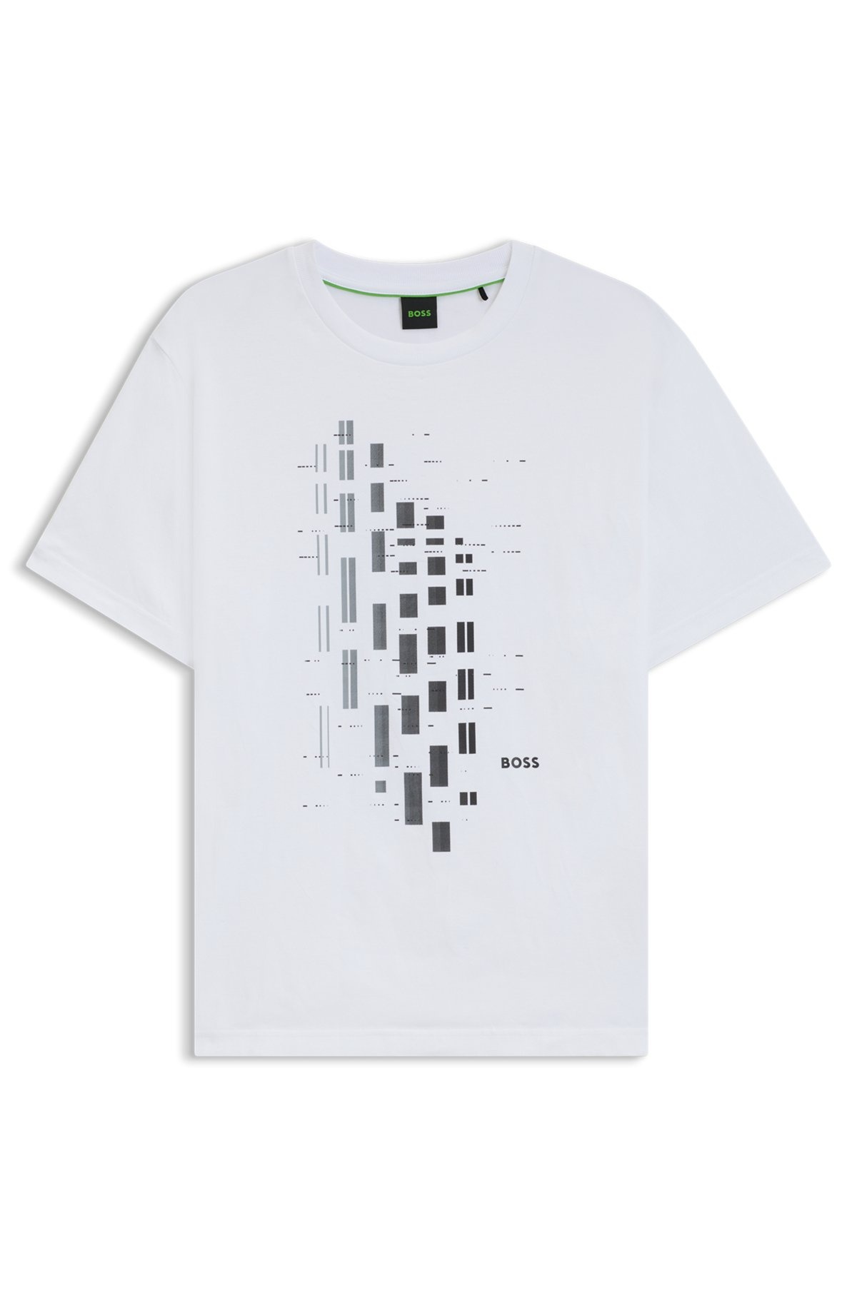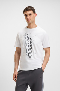 SIZE AND FIT The model wears a size M and is 6'2" tall with a, 38" chest, 31" waist and 38" hips. DETAILS Tee GRX Zone - 50543808 In a casual fit, this BOSS Menswear T-shirt is printed with colorful artwork in a geometric, degrade effect. Breathable stretch-cotton jersey. Regular fit Neckline: Crew neck Short sleeves Standard length QUALITY & CARE INSTRUCTIONS Do Not Bleach Do Not Tumble Dry Quality: 95% Cotton, 5% Elastane, Collar: 95% Cotton, 5% Elastane Do Not Dry Clean Iron Low Heat Machine Wash Cold Gentle