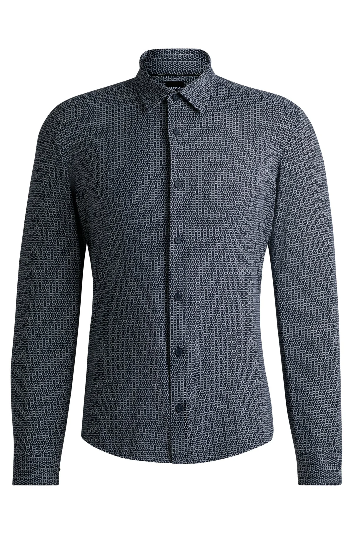 SIZE AND FIT The model wears a size L and is 6'2" tall with a, 37" chest, 29" waist and 37" hips. DETAILS P-ROAN-kent-C1-233 - 50535377 An innovative shirt, featuring a contemporary print, by BOSS Menswear. This piece is tailored to a defined fit in performance-stretch jersey. Slim fit Kent collar Round cuffs QUALITY & CARE INSTRUCTIONS Quality: 87% Polyamide, 13% Elastane Dry Clean Only Do Not Tumble Dry Do Not Bleach Machine Wash Cold Gentle Iron Low Heat
