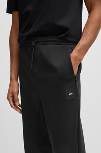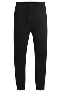 SIZE AND FIT The model wears a size M and is 6'2" tall with a, 34" chest, 28" waist and 33" hips. DETAILS Hadiko Rib - 50537198 With flatlock stitching and sporty cutlines, these BOSS Menswear tracksuit bottoms are easily coordinated with the matching hoodie. Straight fit with cuffed hems. Regular fit Drawstring Pockets bottom front: Zip pockets Pockets bottom back: Welt pocket QUALITY & CARE INSTRUCTIONS Do Not Bleach Iron Low Heat Machine Wash Cold Gentle Do Not Tumble Dry Do Not Dry Clean Quality: 74% Cotton, 17% Polyamide, 9% Elastane, Lining: 100% Polyester, Cuff: 97% Cotton, 3% Elastane, Insert: 96% Cotton, 4% Elastane