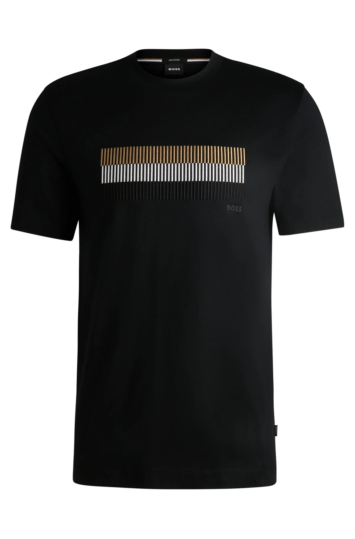 SIZE AND FIT The model wears a size M and is 6'0" tall with a, 33" chest, 29" waist and 36" hips. DETAILS C-Thompson 209 - 50531862 BOSS Menswear's T-shirt is cut to a casual regular fit in extra-soft mercerized cotton. The chest carries brand artwork for signature appeal. Regular fit Neckline: Crew neck Short sleeves Standard length QUALITY & CARE INSTRUCTIONS Do Not Bleach Do Not Tumble Dry Quality: 100% Cotton Do Not Dry Clean Iron Low Heat Machine Wash Cold Gentle