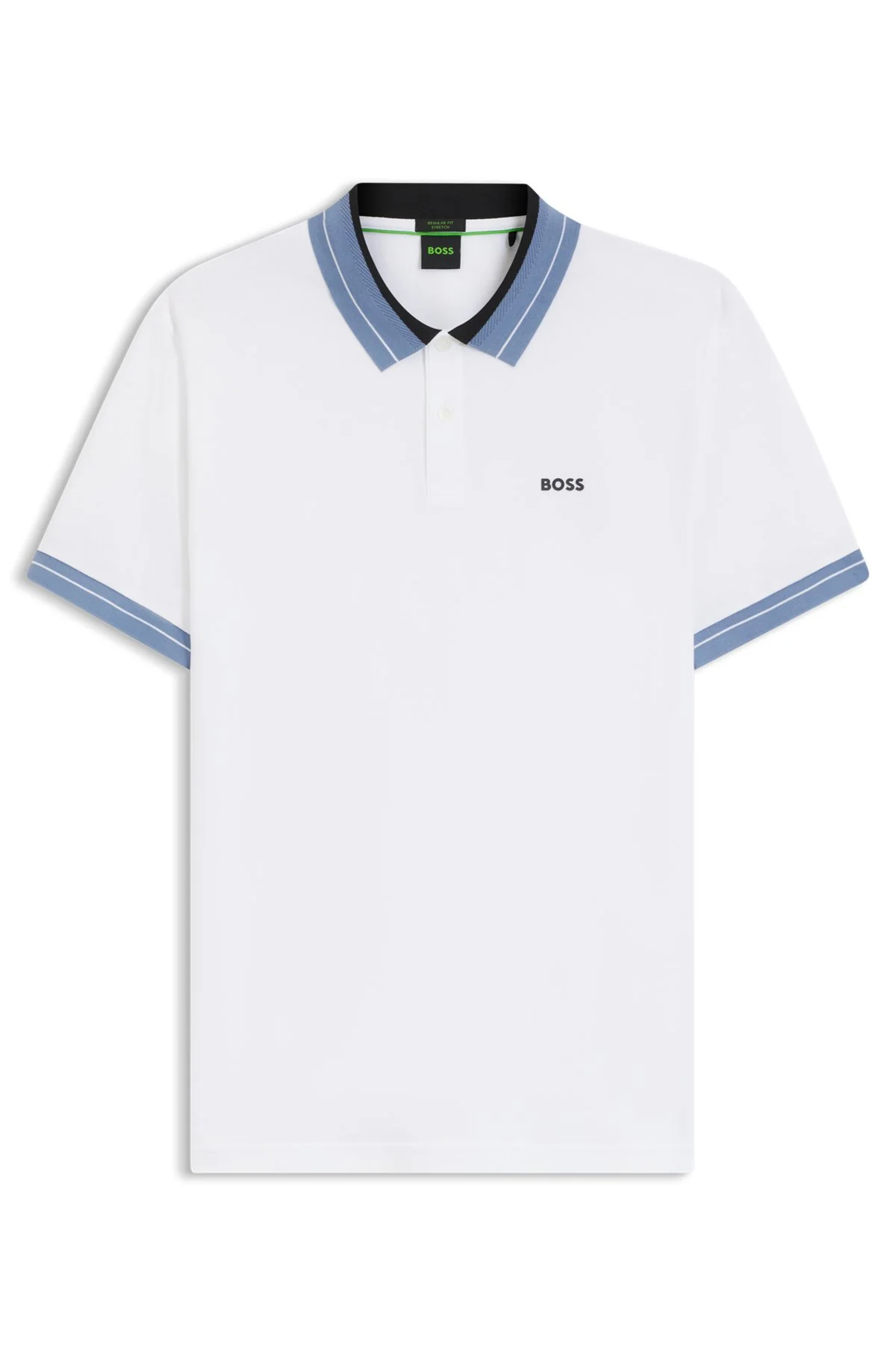 DETAILS With structured and striped trims, this regular-fit BOSS Menswear polo shirt adds energy to casual looks. Stretch cotton for flexible comfort. Regular fit Neckline: Flat-knit collar Number of buttons: 2 Short sleeves Flat-knit cuffs Standard length PL_Member - 50559369 QUALITY & CARE INSTRUCTIONS Iron Low Heat Do Not Tumble Dry Do Not Bleach Machine Wash Cold Gentle Material: 92% Cotton, 8% Elastane Do Not Dry Clean