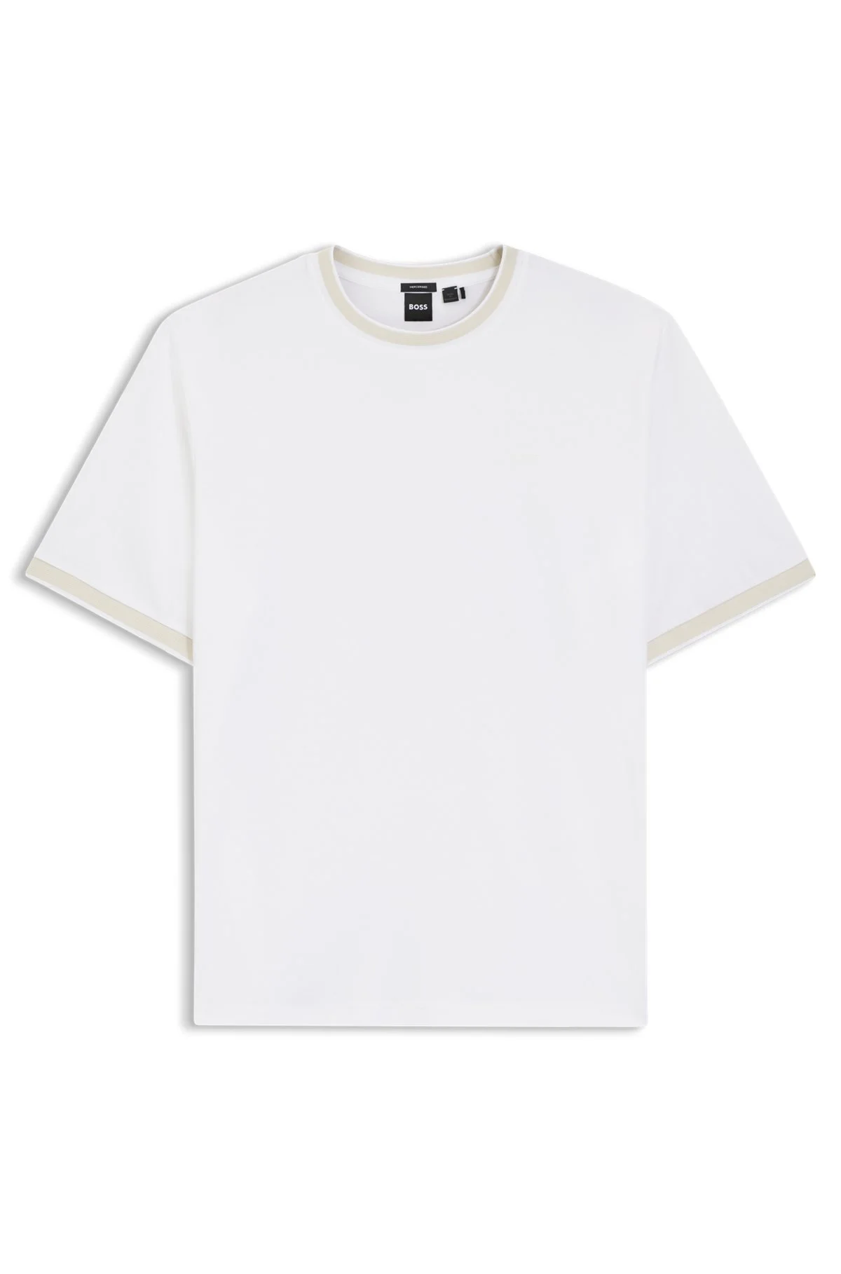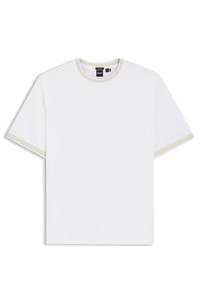 DETAILS Featuring subtle stripes at the collar and cuffs, this BOSS Menswear T-shirt is made in cotton that's been mercerized for creamy softness. Side slits. Neckline: Crew neck Short sleeves Side slit BT_Tessler 200 - 50555216 QUALITY & CARE INSTRUCTIONS Iron Low Heat Do Not Bleach Machine Wash Cold Gentle Do Not Tumble Dry Material: 100% Cotton Do Not Dry Clean