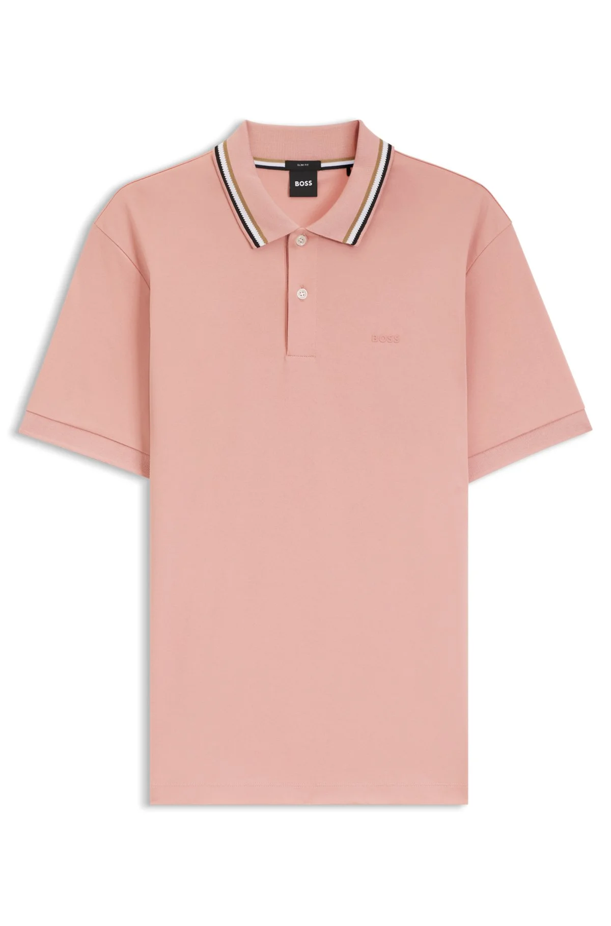 DETAILS A luxurious polo shirt cut to a defined fit, by BOSS Menswear. Featuring signature stripes at the collar, this short-sleeved polo shirt is crafted in mercerized cotton for a super-soft feel and is printed with a tonal BOSS logo at the left chest. The side seam carries a branded flag for a distinctive finish. Slim fit Neckline: Flat-knit collar Number of buttons: 2 Short sleeves No cuffs Standard length Penrose 38 - 50469360 QUALITY & CARE INSTRUCTIONS Iron Low Heat Material: 100% Cotton Do Not Bleach Do Not Tumble Dry Do Not Dry Clean Machine Wash Cold Gentle