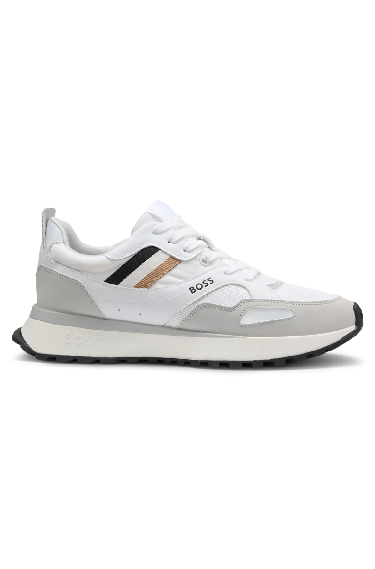 DETAILS Jonah_Runn_mx_N - 50498280 Athletically styled trainers with signature-stripe webbing by BOSS, crafted in a mix of textures including mesh and synthetic coated fabric. Laces Fully lined Packaging: Box QUALITY & CARE INSTRUCTIONS Upper material: 55% Polyurethane, 45% Polyester, Lining: 85% Polyester, 54% Viscose (Bamboo - Cellulose), 46% Polyester, 15% Polyurethane, Sole: 70% Ethylene vinyl acetate, 30% Rubber, Facing: 100% Polyester, 64% Regenerated leather, 36% Polyurethane, Innersole: 54% Viscose (Bamboo - Cellulose), 46% Polyester