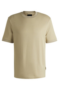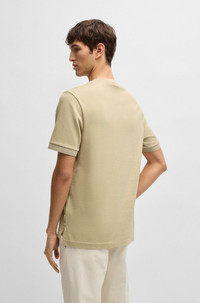 SIZE AND FIT The model wears a size M and is 6'2" tall with a, 37" chest, 30" waist and 37" hips. DETAILS P-Taut 25 - 50537495 Crafted in stretch seersucker fabric for a modern look with breathability, this BOSS Menswear T-shirt has a regular fit. Solid collar and cuffs for contrast. Regular fit Neckline: Crew neck Short sleeves Side slit Standard length QUALITY & CARE INSTRUCTIONS Iron Low Heat Quality: 54% Cotton, 42% Polyester, 4% Elastane Machine Wash Cold Gentle Do Not Bleach Do Not Tumble Dry Do Not Dry Clean