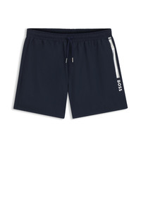 DETAILS With an adjustable drawcord for comfort, these BOSS Menswear swim shorts feature foil-printed branding for a distinctive look. Naturally quick-drying. Straight-cut leg. Elastic waistband Drawstring Pockets bottom front: Side pockets Pockets bottom back: Flap pocket Medium length OLE - 50484440 QUALITY & CARE INSTRUCTIONS Do Not Tumble Dry Do Not Dry Clean Do Not Iron Quality: 100% Polyamid, Lining: 100% Polyester Do Not Bleach Machine Wash Cold