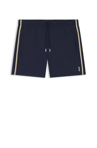 SIZE AND FIT The model wears a size M and is 6'2" tall with a, 38" chest, 31" waist and 37" hips. DETAILS Iconic - 50491594 Fully lined swim shorts by BOSS, detailed with signature stripes and a logo. QUALITY & CARE INSTRUCTIONS Do Not Bleach Do Not Tumble Dry Machine Wash Cold Do Not Iron Quality: 100% Elastomultiester, Lining: 100% Polyester Do Not Dry Clean