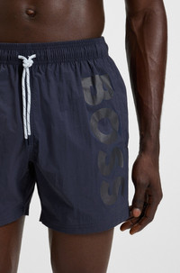 SIZE AND FIT The model wears a size M and is 6'0" tall with a, 36" chest, 31" waist and 35" hips. DETAILS Add impact to beach and pool looks with the large vertical logo print of these BOSS Menswear swim shorts. Naturally quick to dry. Octopus - 50514502 QUALITY & CARE INSTRUCTIONS Machine Wash Cold Do Not Dry Clean Do Not Tumble Dry Do Not Iron Do Not Bleach Material: 100% Polyamide, Lining: 100% Polyester