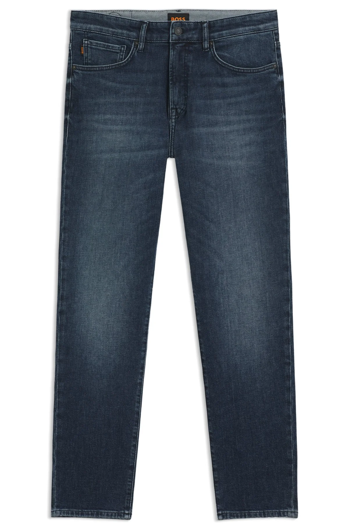 SIZE AND FIT The model wears a size 32/32 and is 6'2" tall with a, 37" chest, 30" waist and 37" hips. DETAILS ONYX BO - 50544651 Cut to a tapered fit, these BOSS Menswear jeans have natural whiskering and lasered effects for added character. Comfort-stretch blue denim. Tapered fit Regular rise Button closure Pockets bottom front: Side pockets Tapered leg Pockets bottom back: Patch pocket Standard length Fit foot width: 34,0 cm (13.4 inches) QUALITY & CARE INSTRUCTIONS Iron Medium Heat Machine Wash Cold Gentle Quality: 99% Cotton, 1% Elastane Do Not Dry Clean Do Not Tumble Dry Do Not Bleach