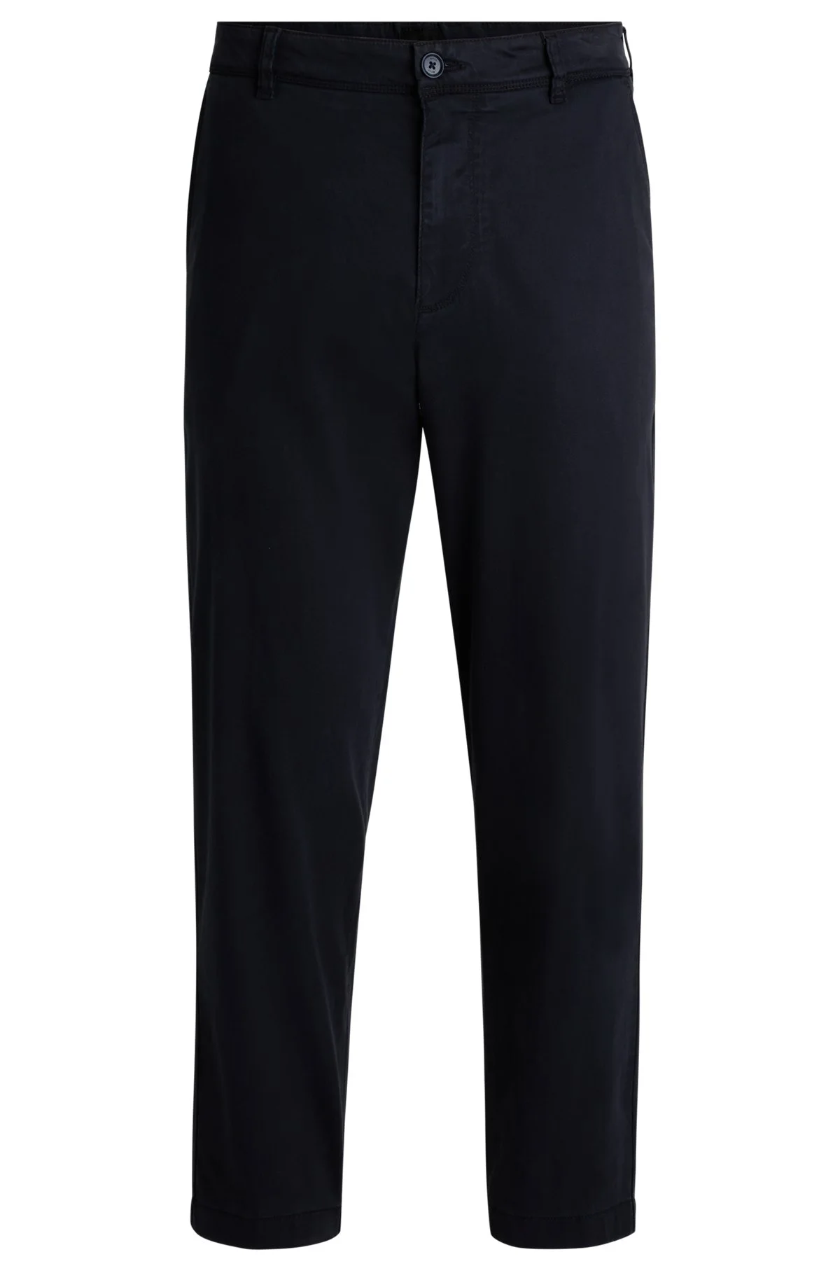 SIZE AND FIT The model wears a size 32R and is 6'2" tall with a, 37" chest, 33" waist and 35" hips. DETAILS C-Perin-CW - 50522666 Regular-rise trousers in a tapered fit by BOSS Menswear. This casual pair is crafted in stretch twill for comfort in movement. Tapered fit Regular rise Button and zip closure Elastic Waistband Tapered leg Pockets bottom front: French pocket Pockets bottom back: Welt pocket with buttons QUALITY & CARE INSTRUCTIONS Iron Low Heat Machine Wash Cold Gentle Quality: 93% Lyocell, 6% Elastomultiester, 1% Elastane, pocketing: 50% Polyester, 50% Cotton Reduced Dry Clean Do Not Bleach Do Not Tumble Dry