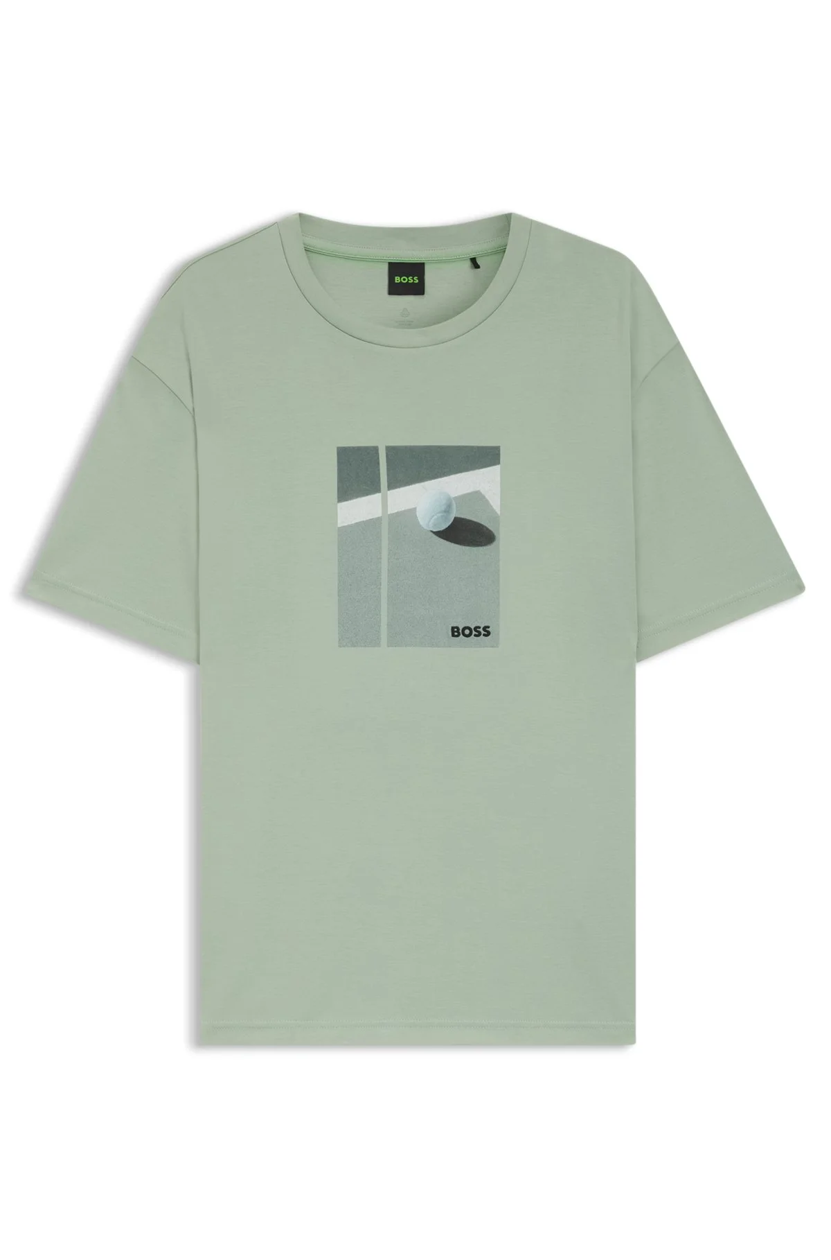 SIZE AND FIT The model wears a size M and is 6'2" tall with a, 37" chest, 29" waist and 37" hips. DETAILS With its straight fit and tennis-themed artwork, this BOSS Menswear T-shirt will refresh any casual wardrobe. Crafted in extra-soft Pima cotton. Crew neckline. Regular fit Neckline: Crew neck Short sleeves Standard length TS_Join Relaxed GRX - 50554365 QUALITY & CARE INSTRUCTIONS Material: 100% Cotton Machine Wash Cold Gentle Do Not Bleach Do Not Tumble Dry Do Not Dry Clean Iron Low Heat