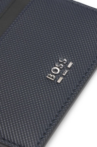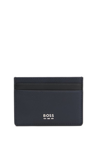 DETAILS Jinko_Card holder - 50536095 A BOSS Menswear card holder, designed in sporty textured material offset by smooth facings. Signature details add plenty of BOSS character. Measurements: 10 x 7cm Length: 10,0 cm (3.9 inches) Height: 7,0 cm (2.8 inches) 1 main compartment 4 credit card slots Hardware finishing: Polished silver hardware Fully lined Metal letters Packaging: Box QUALITY & CARE INSTRUCTIONS Quality: 70% Polyurethane (62% recycled), 30% Polyester, Lining: 100% Polyester, Facing: 70% Polyurethane (62% recycled), 30% Polyester