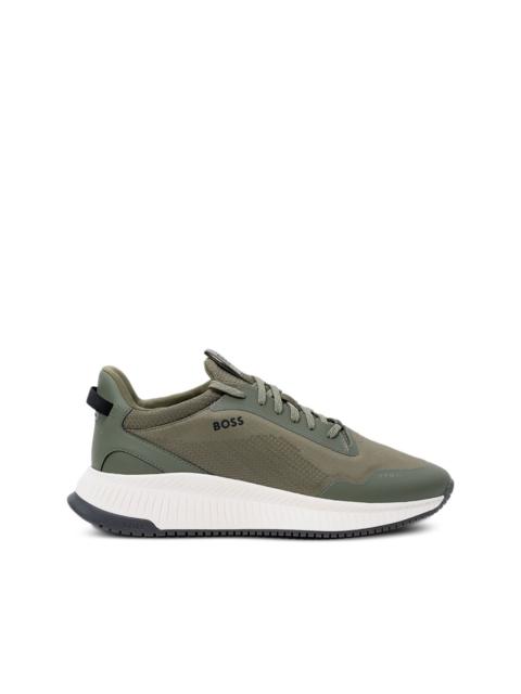 textured lace-up low-top sneakers Highlights - Black - Leather upper - Mesh panels - Lace-up fastening - Pull tab Imported Composition Outer: Calf Leather 100%, Polyester 100% Sole: Polyethylene vinyl acetate (PEVA) 70%, Rubber 30% Lining: Polyester 100%