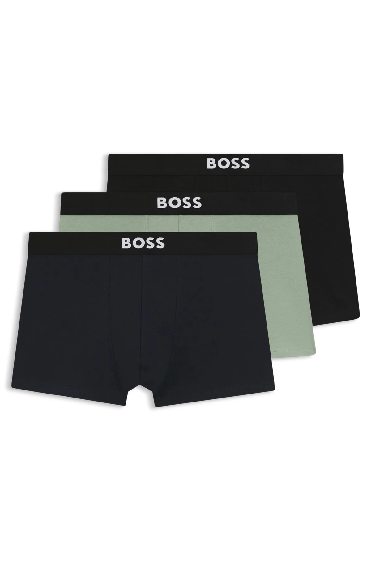 SIZE AND FIT The model wears a size M and is 6'2" tall with a, 36" chest, 31" waist and 38" hips. DETAILS With their ergonomic fit and soft stretch-cotton jersey, these three pairs of BOSS Menswear trunks offer refined comfort. Contrast logo on waistband. Packaging: Box Exposed waistband Regular rise Trunk 3P BOSS ONE - 50544263 QUALITY & CARE INSTRUCTIONS Machine Wash Warm Do Not Dry Clean Do Not Bleach Tumble Dry Low Heat Iron Low Heat Material: 95% Cotton, 5% Elastane, Waistband: 57% Polyamid, 30% Polyester, 13% Elastane