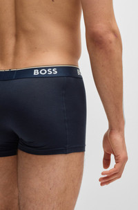 SIZE AND FIT The model wears a size M and is 6'2" tall with a, 37" chest, 29" waist and 37" hips. DETAILS Trunk 3P Power Desig - 50531701 A trio of printed and plain trunks in stretch-cotton by BOSS Menswear. Each pair has a regular-rise waist with signature stripes and logos. Packaging: Box Exposed waistband Regular rise QUALITY & CARE INSTRUCTIONS Tumble Dry Low Heat Iron Medium Heat Machine Wash Warm Do Not Dry Clean Do Not Bleach Quality: 95% Cotton, 5% Elastane, Waistband: 53% Polyamid, 34% Polyester, 13% Elastane