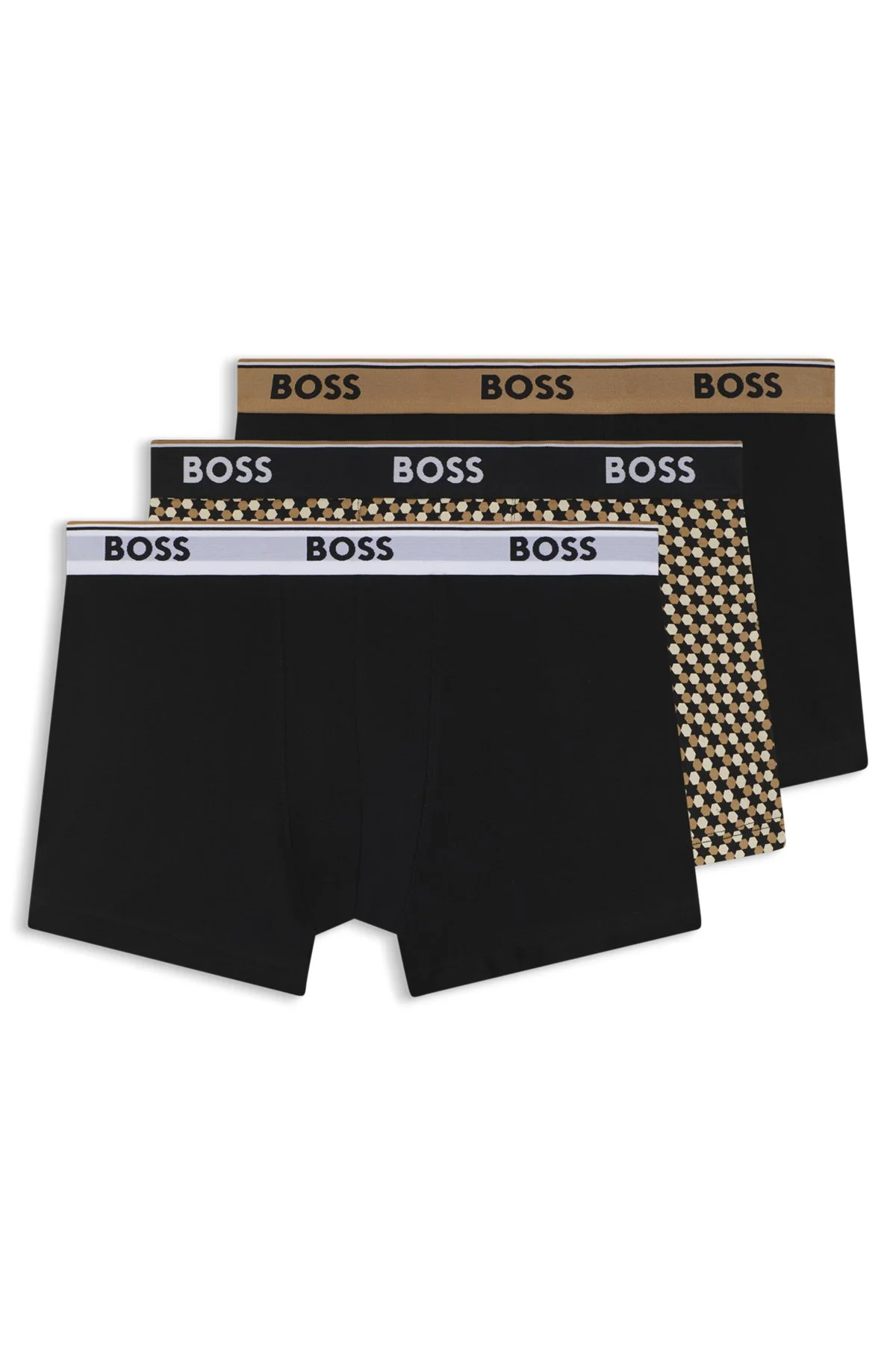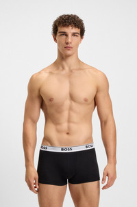 SIZE AND FIT The model wears a size M and is 6'0" tall with a, 38" chest, 29" waist and 38" hips. DETAILS A trio of printed and plain trunks in stretch-cotton by BOSS Menswear. Each pair has a regular-rise waist with signature stripes and logos. Packaging: Box Exposed waistband Regular rise Trunk 3P Power Desig - 50531701 QUALITY & CARE INSTRUCTIONS Do Not Dry Clean Machine Wash Warm Tumble Dry Low Heat Do Not Bleach Material: 95% Cotton, 5% Elastane, Waistband: 53% Polyamid, 34% Polyester, 13% Elastane Iron Medium Heat