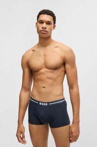 SIZE AND FIT The model wears a size M and is 6'2" tall with a, 38" chest, 29" waist and 38" hips. DETAILS Trunk 3P Bold - 50532453 Designed for a comfortable fit, these BOSS Menswear trunks are ideal for everyday dressing. Crafted in breathable stretch cotton with logo waistbands. Convenient triple pack. This product is partly made with . Our standards do not allow the use of synthetic fertilizers, pesticides or genetically modified seeds. Packaging: Box Exposed waistband Regular rise QUALITY & CARE INSTRUCTIONS Quality: 95% Cotton, 5% Elastane, Waistband: 59% Polyamid, 28% Polyester, 13% Elastane Tumble Dry Low Heat Do Not Bleach Machine Wash Warm Iron Low Heat Do Not Dry Clean