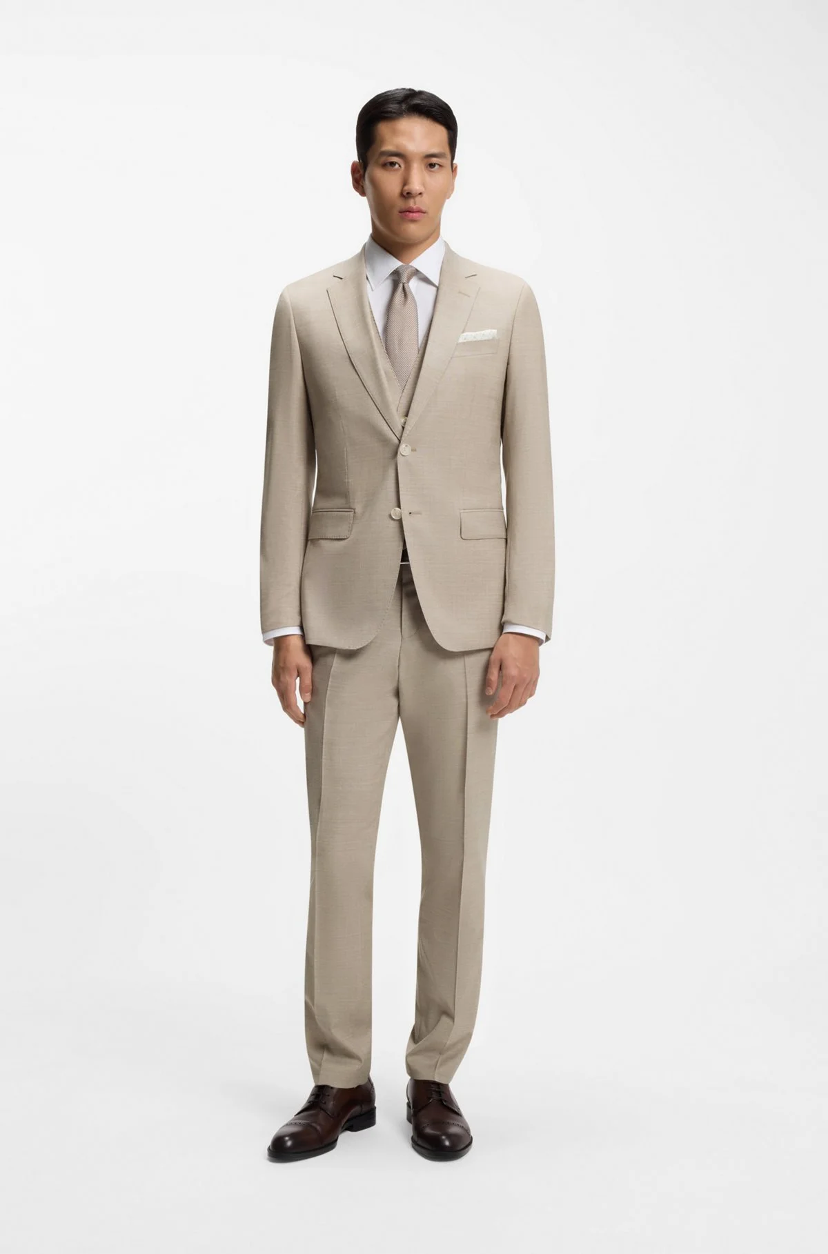 DETAILS Build a host of formal looks with this heritage-inspired BOSS Menswear suit. Tailored to a modern slim fit, this three-piece suit is crafted in virgin wool blended with stretch for comfort and crease control. The fabric has a subtle micro pattern that you'll find easy to style. Slim fit H-Huge-3Pcs-253 - 50564771 QUALITY & CARE INSTRUCTIONS Do Not Tumble Dry Do Not Wash Material: 99% Virgin wool, 1% Elastane, Lining: 100% Viscose, Sleeve lining: 100% Viscose, pocketing: 65% Polyester, 35% Cotton, knee lining: 100% Viscose Do Not Bleach Iron Low Heat Reduced Dry Clean