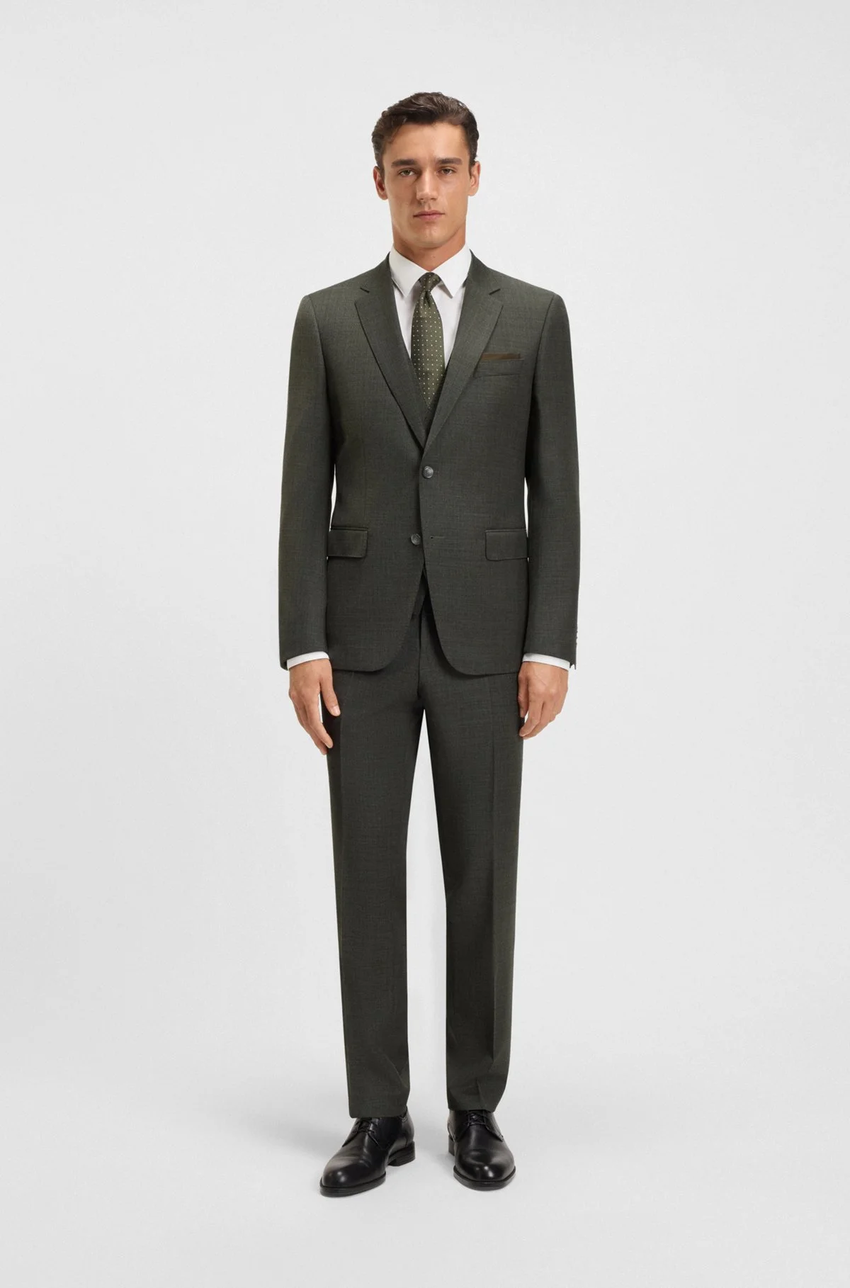 SIZE AND FIT The model wears a size 40R and is 6'1" tall with a, 37" chest, 29" waist and 35" hips. DETAILS Update your formal attire with this three-piece BOSS Menswear suit. Tailored to a slim fit with constructed shoulders for a modern profile, this timeless suit is cut in wool blended with stretch for ultimate comfort. The fabric features a micro pattern that's easy to style. Slim fit Notched lapels Number of buttons: 2 Jetted chest pockets Pockets top: Flap pockets Kissing buttons on the cuff Fully lined H-Huge-3Pcs-253 - 50551768 QUALITY & CARE INSTRUCTIONS Reduced Dry Clean Material: 99% Virgin wool, 1% Elastane, Lining: 65% Viscose, 35% Polyester, Sleeve lining: 100% Viscose, pocketing: 65% Polyester, 35% Cotton, knee lining: 100% Viscose Do Not Wash Do Not Tumble Dry Iron Low Heat Do Not Bleach