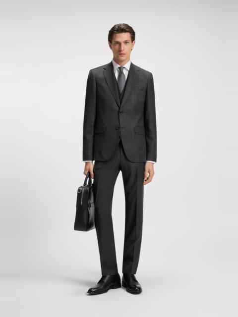 DETAILS Update your formal attire with this three-piece BOSS Menswear suit. Tailored to a slim fit with constructed shoulders for a modern profile, this timeless suit is cut in wool blended with stretch for ultimate comfort. The fabric features a micro pattern that's easy to style. Slim fit Notched lapels Number of buttons: 2 Jetted chest pockets Pockets top: Flap pockets Kissing buttons on the cuff Fully lined H-Huge-3Pcs-253 - 50551768 QUALITY & CARE INSTRUCTIONS Reduced Dry Clean Material: 99% Virgin wool, 1% Elastane, Lining: 65% Viscose, 35% Polyester, Sleeve lining: 100% Viscose, pocketing: 65% Polyester, 35% Cotton, knee lining: 100% Viscose Do Not Wash Do Not Tumble Dry Iron Low Heat Do Not Bleach