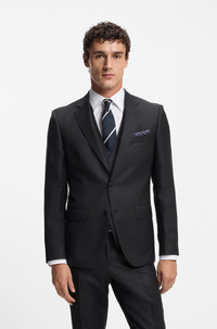 DETAILS Prepare for formal events with this three-piece BOSS Menswear suit. Crafted in wool with natural stretch for easy movement, this fully lined ensemble is tailored to a slim fit delivering a clean profile. The midweight fabric features a micro pattern that's easy to accessorize. Slim fit Notched lapels Fastening top: Button closure Number of buttons: 2 Jetted chest pockets Pockets top: Flap pockets Fully lined Hook and zip closure Pockets bottom front: Side slash pockets Pockets bottom back: Welt pocket H-Huge-3Pcs-253 - 50551771 QUALITY & CARE INSTRUCTIONS Reduced Dry Clean Do Not Bleach Material: 100% Virgin wool, Lining: 65% Viscose, 35% Polyester, Sleeve lining: 100% Viscose, pocketing: 65% Polyester, 35% Cotton, knee lining: 100% Viscose Iron Low Heat Do Not Tumble Dry Do Not Wash