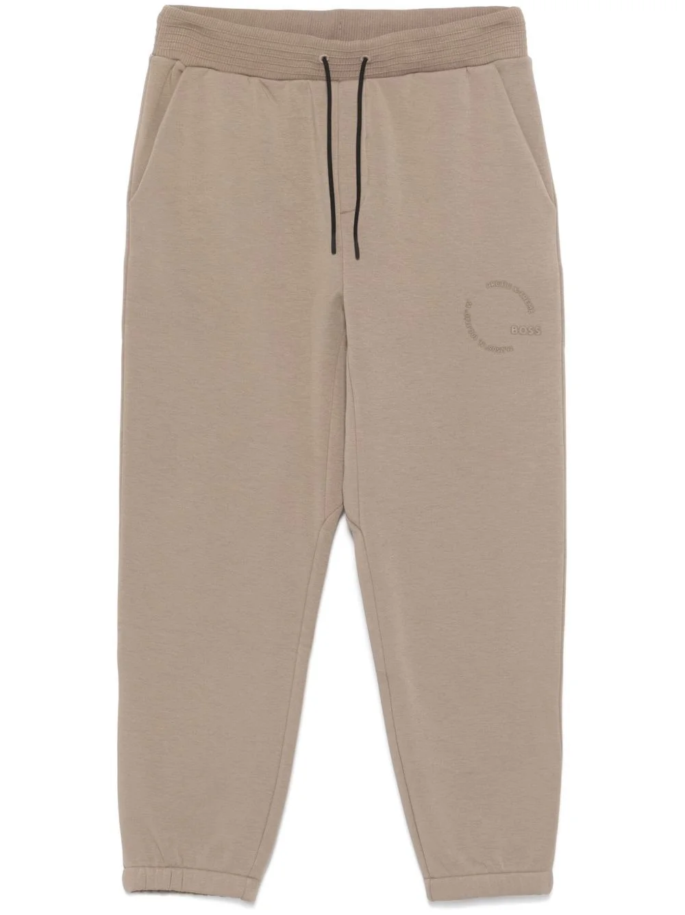 tonal-artwork track pants Highlights - Olive brown - Jersey - Tonal artwork - Elasticated waistband with internal drawstring - Two diagonal pockets to the sides - Elasticated ankles - Rear patch pocket - Fleece lining - Tapered leg Imported Composition Polyester 58%, Cotton 39%, Elastane 3%
