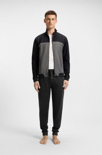 SIZE AND FIT The model wears a size M and is 6'1" tall with a, 38" chest, 29" waist and 37" hips. DETAILS Tracksuit Pants - 50545579 Upgrade your downtime options with these cuffed BOSS Menswear tracksuit bottoms. Soft pique with a metal logo plate and pocket detailing. Covered waistband Drawstring Pockets bottom front: Zip pockets QUALITY & CARE INSTRUCTIONS Quality: 70% Cotton, 30% Polyester Machine Wash Warm Do Not Dry Clean Do Not Tumble Dry Do Not Bleach Iron Low Heat