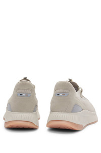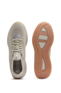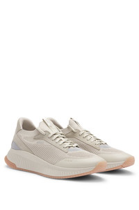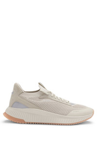 DETAILS TTNM EVO_Slon_knrsd - 50523113 Crafted in a combination of materials, including leather trims, these running-style BOSS Menswear trainers strike a distinctive profile. Lightweight ridged outsole. Knitted uppers for enhanced comfort and fit. Laces Partially lined Packaging: Box QUALITY & CARE INSTRUCTIONS Upper material: 100% Polyester (85% recycled), Lining: 100% Polyester (85% recycled), 100% Polyester, 85% Polyester, 15% Polyurethane, Sole: 70% Ethylene vinyl acetate, 30% Rubber, Facing: 100% Thermoplastic polyurethane , 100% Cow leather, Innersole: 100% Polyester