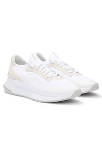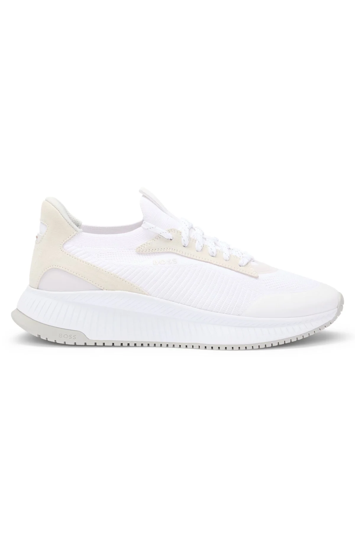 DETAILS TTNM EVO_Slon_knrsd - 50523113 Crafted in a combination of materials, including leather trims, these running-style BOSS Menswear trainers strike a distinctive profile. Lightweight ridged outsole. Knitted uppers for enhanced comfort and fit. Laces Partially lined Packaging: Box QUALITY & CARE INSTRUCTIONS Upper material: 100% Polyester (85% recycled), Lining: 100% Polyester (85% recycled), 100% Polyester, 85% Polyester, 15% Polyurethane, Sole: 70% Ethylene vinyl acetate, 30% Rubber, Facing: 100% Thermoplastic polyurethane , 100% Cow leather, Innersole: 100% Polyester
