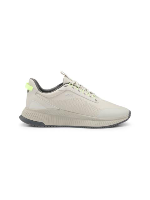DETAILS TTNM EVO_Runn_rsth - 50529544 Modern TTNM EVO trainers with a distinctive ribbed outsole by BOSS. This ultra-lightweight pair features thermo-bonded uppers and branding throughout. Laces Fully lined Packaging: Box QUALITY & CARE INSTRUCTIONS Upper material: 100% Polyester, Lining: 100% Polyester, 85% Polyester, 15% Polyurethane, Sole: 70% Ethylene vinyl acetate, 30% Rubber, Facing: 100% Thermoplastic polyurethane , 60% Polyester, 40% Polyurethane, Innersole: 100% Polyester