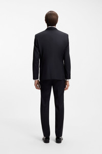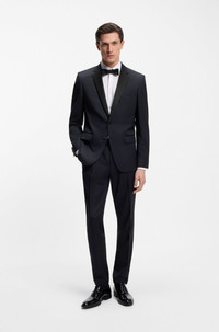 SIZE AND FIT The model wears a size 38L and is 6'2" tall with a, 37" chest, 29" waist and 37" hips. DETAILS H-Huge-Tux-N-B1 - 50469191 An elegant jacket by BOSS Menswear. Crafted in serge-woven cloth for a refined look and feel, this jacket is trimmed with silk-blend accents for tuxedo styling. For our RESPONSIBLE products, we always use at least 60% more sustainable raw materials. This garment is made from at least 60% responsible and certified wool. At HUGO BOSS, responsible wool means it meets the standards of the Five Freedoms of animal welfare. Slim fit Notched lapels Number of buttons: 2 Welt chest pockets Pockets top: Flap pockets Inside jet pocket with button Kissing buttons on the cuff Side vent Fully lined QUALITY & CARE INSTRUCTIONS Quality: 100% Virgin wool, Lining: 65% Viscose, 35% Polyester, Facing: 78% Silk, 22% Polyester, Sleeve lining: 100% Viscose, pocketing: 100% Cotton Do Not Tumble Dry Do Not Bleach Do Not Wash Iron Low Heat Reduced Dry Clean
