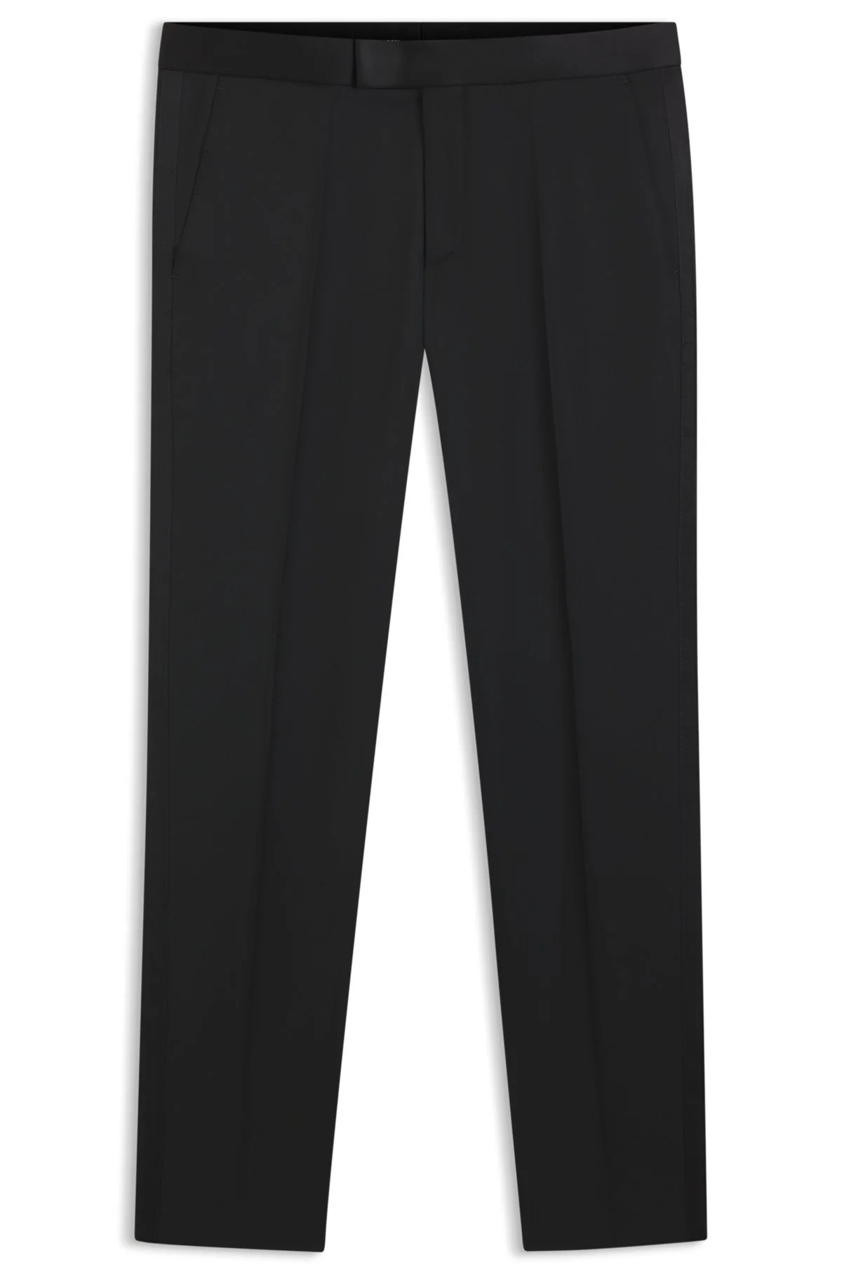 SIZE AND FIT The model wears a size 32R and is 6'2" tall with a, 35" chest, 30" waist and 36" hips. DETAILS H-Genius-Tux-B1 - 50469186 Timeless trousers by BOSS Menswear. Trimmed with tonal accents in a silk blend for tuxedo styling, these trousers are crafted in serge-woven cloth. For our RESPONSIBLE products, we always use at least 60% more sustainable raw materials. This garment is made from at least 60% responsible and certified wool. At HUGO BOSS, responsible wool means it meets the standards of the Five Freedoms of animal welfare. Slim fit Hook and zip closure Crease Pockets bottom front: French pocket Pockets bottom back: Welt pocket QUALITY & CARE INSTRUCTIONS Iron Low Heat Do Not Wash Reduced Dry Clean Do Not Bleach Do Not Tumble Dry Quality: 100% Virgin wool, Waistband: 78% Silk, 22% Polyester, pocketing: 65% Polyester, 35% Cotton, knee lining: 100% Viscose