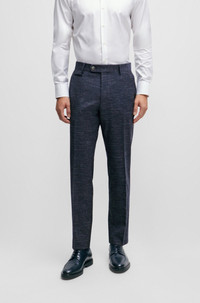 SIZE AND FIT The model wears a size 32R and is 6'1" tall with a, 36" chest, 29" waist and 34" hips. DETAILS H-Genius-241 - 50509537 New-season tailored trousers by BOSS Menswear, cut to a defined fit in a soft, patterned wool blend containing touches of cotton and linen. Slim fit QUALITY & CARE INSTRUCTIONS Do Not Bleach Do Not Tumble Dry Do Not Wash Iron Low Heat Reduced Dry Clean Quality: 64% Virgin wool, 26% Cotton, 7% Linen, 2% Polyamid, 1% Elastane, pocketing: 65% Polyester, 35% Cotton, knee lining: 100% Viscose