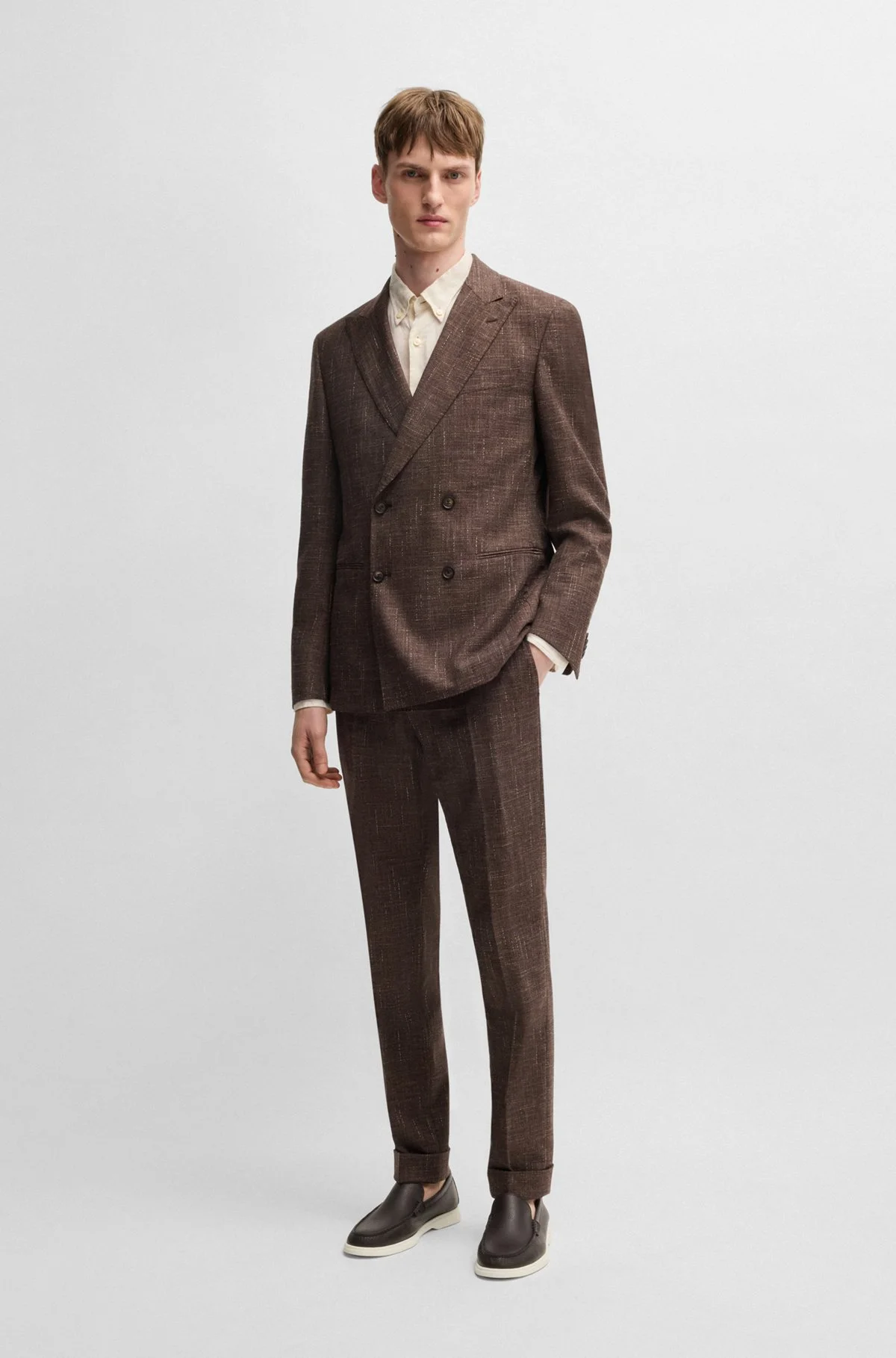 SIZE AND FIT The model wears a size 38R and is 6'2" tall with a, 36" chest, 31" waist and 35" hips. DETAILS C-Huge-2Pcs-DB-252 - 50540783 A summer-ready suit by BOSS Menswear. Crafted in midweight tweed blended with cotton and wool, this two-piece suit contains a touch of stretch for wrinkle resistance and flexible comfort. Complete the look with a BOSS shirt or fine-gauge knitwear. Slim fit Peaked lapels Number of buttons: 4 or more buttons Unlined Packaging: Dust bag QUALITY & CARE INSTRUCTIONS Iron Low Heat Do Not Wash Quality: 46% Cotton, 42% Virgin wool, 7% Polyamid, 4% Polyacrylic, 1% Elastane, Lining: 65% Viscose, 35% Polyester, Sleeve lining: 100% Viscose, knee lining: 100% Viscose Reduced Dry Clean Do Not Bleach Do Not Tumble Dry