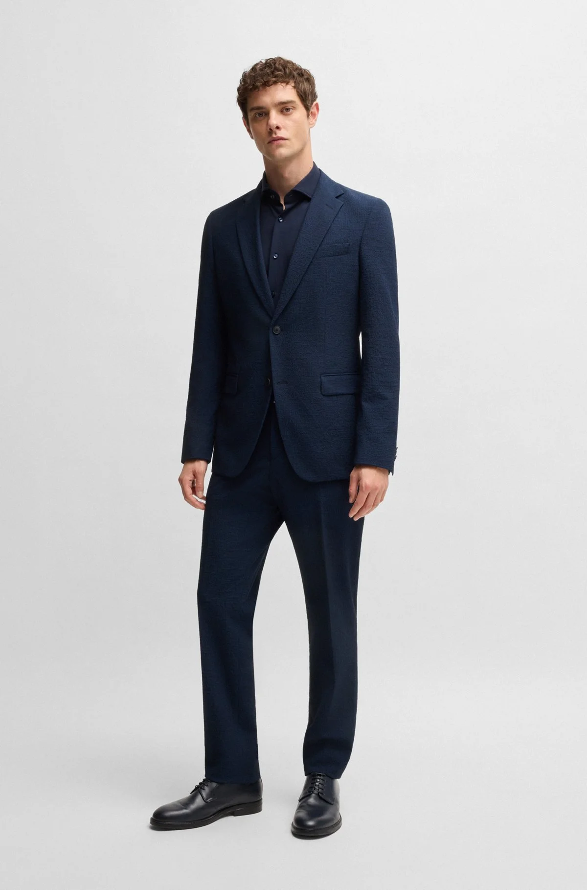 SIZE AND FIT The model wears a size 40L and is 6'2" tall with a, 37" chest, 31" waist and 37" hips. DETAILS P-Huge-2Pcs-252 - 50540771 An easy-care option, this BOSS Menswear suit is ideal for summer functions. The seersucker fabric is blended with generous stretch, affording you refined comfort and dependable wrinkle resistance. Complete this suit with a BOSS shirt and accessories. Unlined QUALITY & CARE INSTRUCTIONS Do Not Bleach Quality: 78% Polyester (39% recycled), 20% Viscose, 2% Elastane, Lining: 60% Polyamid, 40% Polyester, Sleeve lining: 64% Viscose, 36% Polyester, pocketing: 65% Polyester, 35% Cotton, knee lining: 100% Viscose Reduced Dry Clean Do Not Tumble Dry Do Not Wash Iron Low Heat