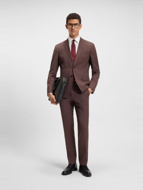 SIZE AND FIT The model wears a size 38R and is 6'2" tall with a, 35" chest, 29" waist and 35" hips. DETAILS With elegant silk-blend trims, this BOSS Menswear tuxedo suit is a modern way to honor the dress code. Crafted in an Italian-made wool-rich blend, this two-piece suit is tailored to our slim profile for clean lines. Waistband adjusters deliver a custom fit for formal comfort. Slim fit Shawl collar Number of buttons: 1 Jetted chest pockets Pockets top: Welt pockets Kissing buttons on the cuff Fully lined Packaging: Dust bag H-Huge-2pcs-TuxS-254 - 50551762 QUALITY & CARE INSTRUCTIONS Reduced Dry Clean Do Not Wash Material: 73% Virgin wool, 27% Mohair, Lining: 100% Viscose, Facing: 78% Silk, 22% Polyester, Sleeve lining: 64% Viscose, 36% Polyester, pocketing: 65% Polyester, 35% Cotton, knee lining: 100% Viscose Do Not Tumble Dry Iron Low Heat Do Not Bleach